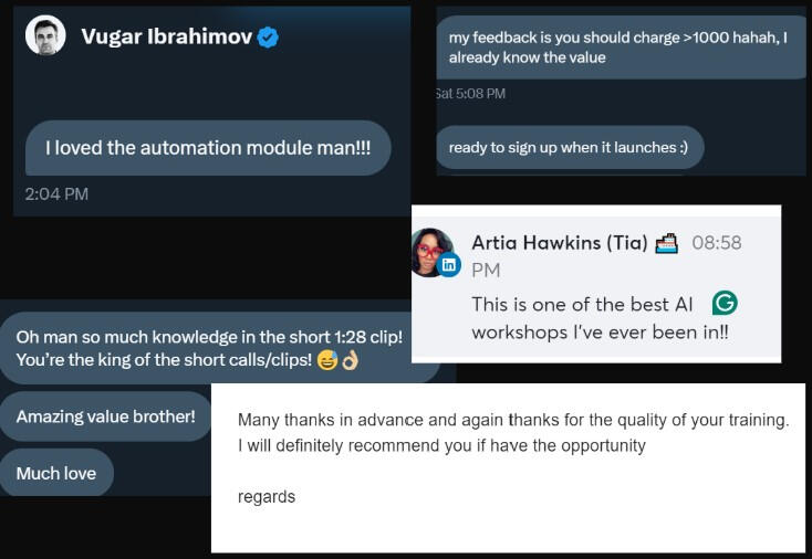 Secure the lowest price today.Prices rise with every round, because the material keeps getting better after dozens of iterations, coaching groups around the world.I guarantee that you will learn more in this week, with the workshop, than with the 10.000 free courses and low quality tutorials out there that just end up wasting even more of your time.Lastly: If it doesn't work for you, 30 day money back guarantee.Your peace of mind and success are my priority. But you have to apply what I give you FIRST.I wanna make it EASY and SAFE for you to take action.No coding experience needed, I will facilitate everything and you can get results immediately after the session.Starts Tuesday January 21st. Workshop + 1 week support.If you can't make it on that specific day, DM or email me, and I'll find a solution for you so you don't miss out on a top-tier practical AI workshop.