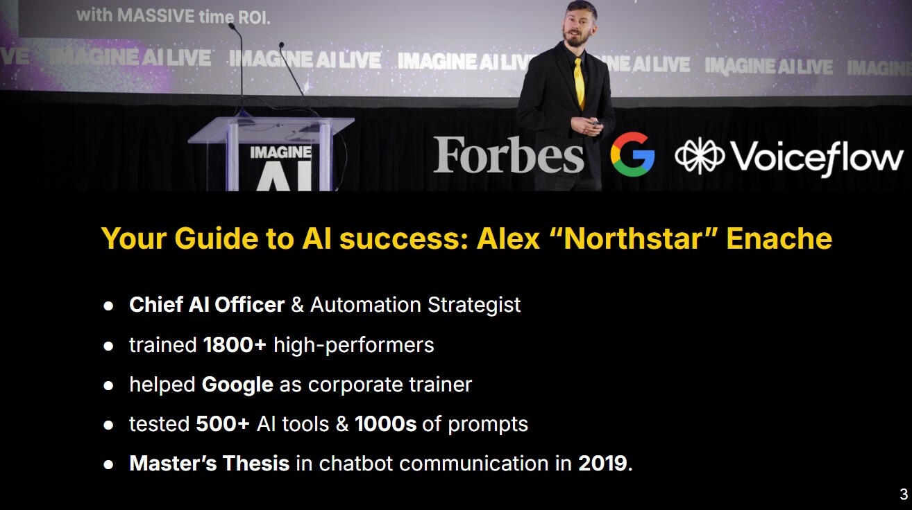 Your Human Guide to Success with AI: Alex Northstar Enache- helped 1800+ high-performers- international speaker on practical AI- Linkedin Top AI Voice- helped Google as ex corporate trainer- AI automation & productivity consultantDid public speaking and workshop experiences in Las Vegas, New York, at the university in Italy and also cooperating with AI thought leaders around the world.What I give to people is what I use for myself daily, so I practice what I preach.
